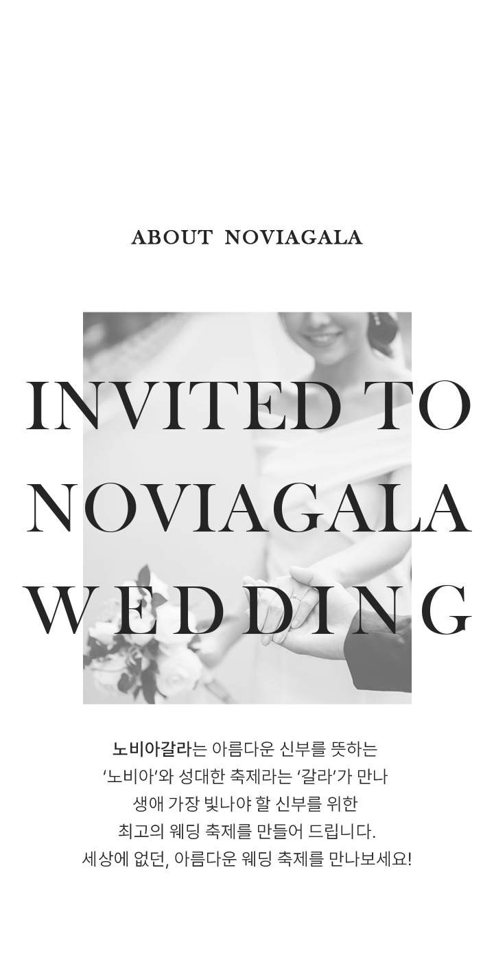 ABOUT NOVIAGALA INVITED TO NOVIAGALA WEDDING 노비아갈라는 아름다운 신부를 뜻하는 ‘노비아’와 성대한 축제라는 ‘갈라’가 만나 생애 가장 빛나야 할 신부를 위한 최고의 웨딩 축제를 만들어 드립니다. 세상에 없던, 아름다운 웨딩 축제를 만나보세요!